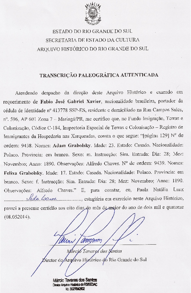 Deram entrada na Hospedaria da Ilha das Flores em 18/nov/1890 (Lv.49, fl. 56v e 57, no. de ordem 46746 e 46747), vindos no navio Main, procedentes de Bremen, Seguiram para Porto Alegre-RS, onde deram entrada na Hospedaria do Cristal em 28/nov/1890