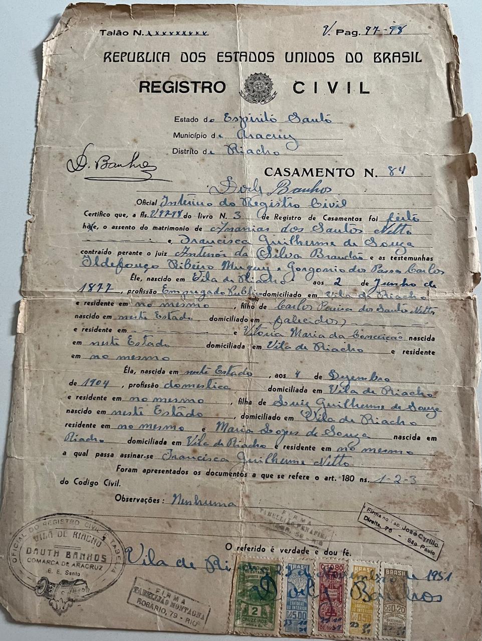 nasceu em 04-12-1904, conforme batismo folha 122-37 na Vila do Riacho-ES, casou-se em 1928)