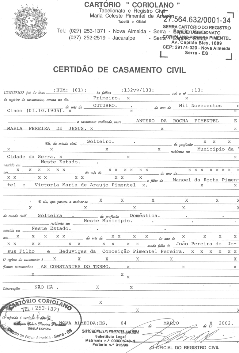 Antero da Rocha Pimentel casou conforme Livro 01- fls132v/133 Cartório Coriolano, 01/10/1905, com