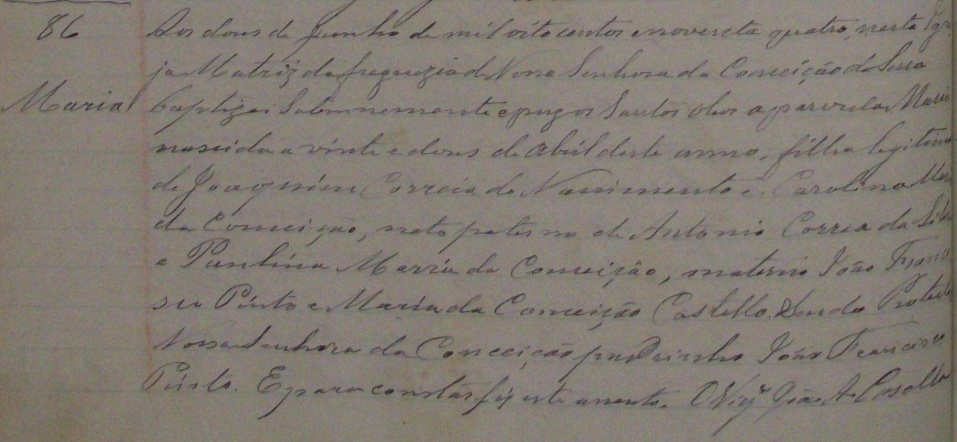 - Maria, nascida no dia 08/12/1849, batizada no dia 09/05/1850, na Matriz da Serra-ES