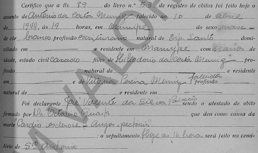 Antonio da Costa Muniz, faleceu no dia 10/04/1944, às 19 horas, com 53 anos de idade em Maruipe-ES