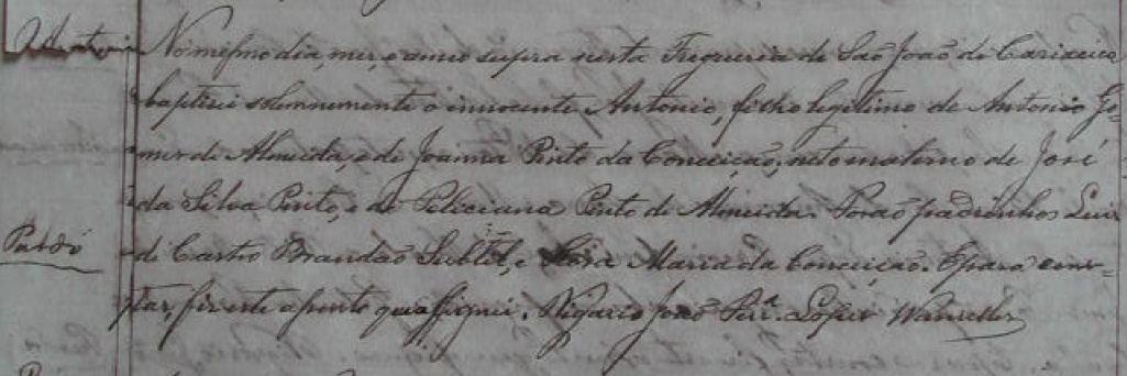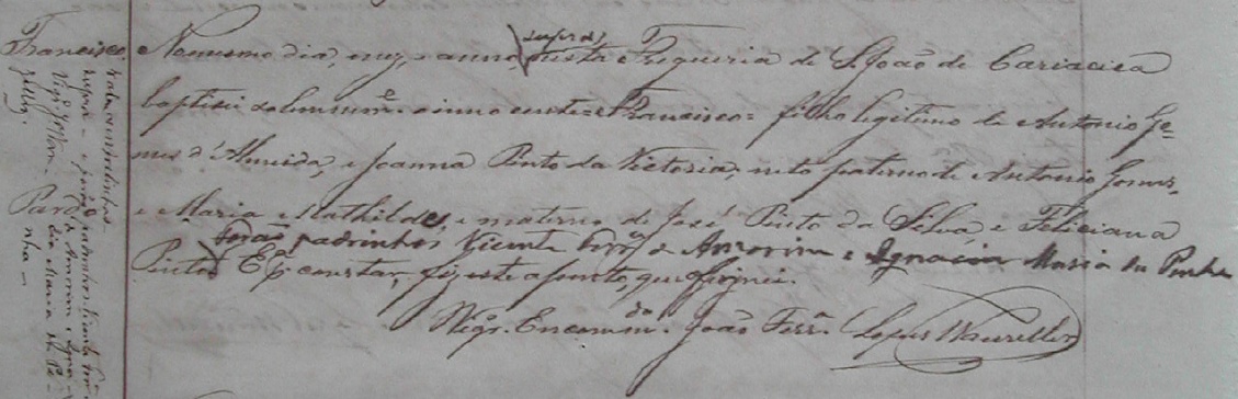Padrinhos: Vicente Ferreira de Amorim e Ignacia Maria da Penha