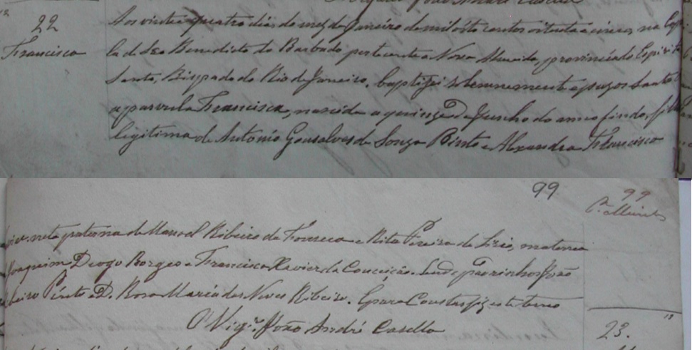 Francisca, nascida no dia 15/06/1884, batizada no dia 24/01/1885, em São Benedito de Barbado, pertencente a Nova Almeida-ES