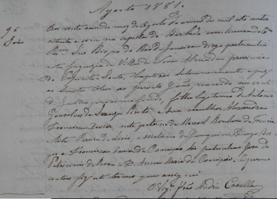 João, nascido no dia 20/07/1881, batizado no dia 21/08/1881, na Capela do Barbado, pertencente à Freguesia da Vila de Nova Almeida-ES