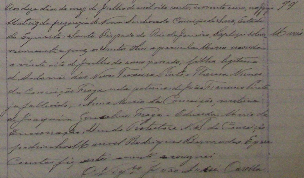 - Maria, nascida no dia 28/07/1890, batizada no dia 10/07/1891, na Igreja Matriz da Freguezia de Nossa senhora da Conceição da Serra-ES