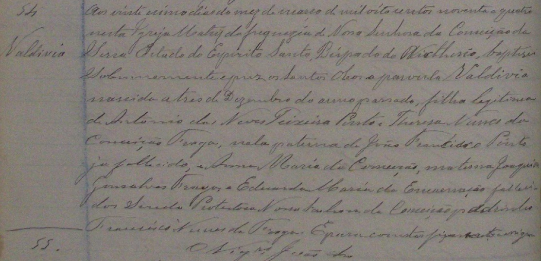 - Valdivia, nascida no dia 03/12/1893, batizada no dia 25/03/1894, na Igreja Matriz da Freguezia de Nossa senhora da Conceição da Serra-ES
