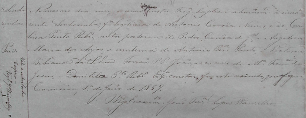 - Senhorinha, batizada no dia 01/01/1857, na Freguesia de Cariacica-ES