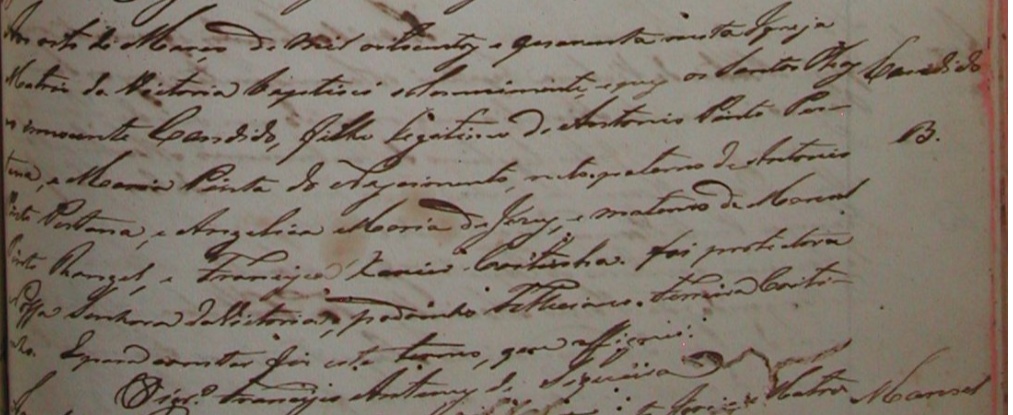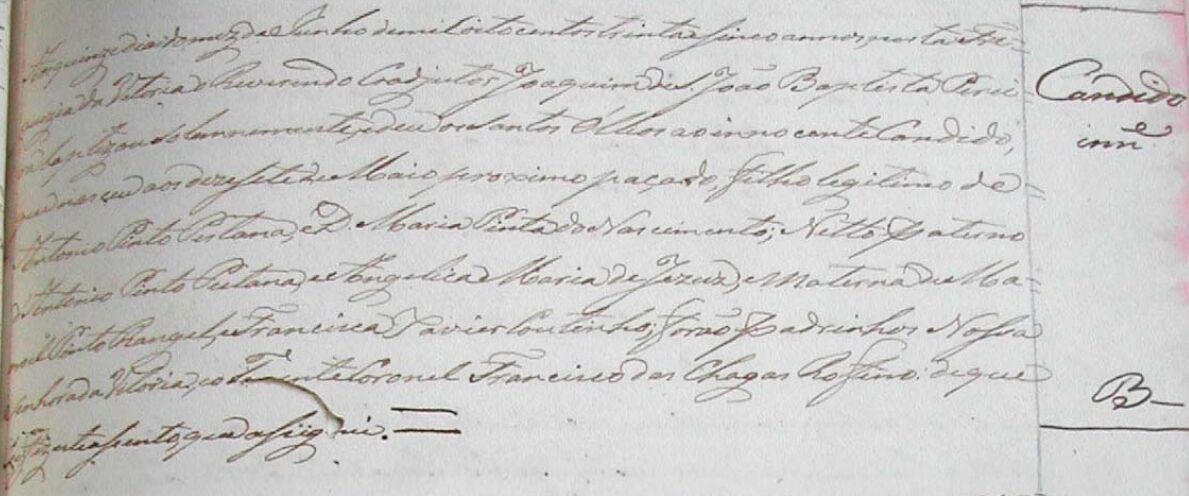 - Candido, nascido a 17/5/1834, batizado em 15/6/1835, na Freguesia de Vitoria-ES