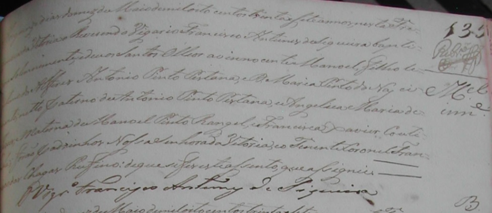 Testemunhas: Manoel Pinto Ribeiro dos Passos , Manoel Antonio ? de Santa Anna e Francisca Pinto de Jesus