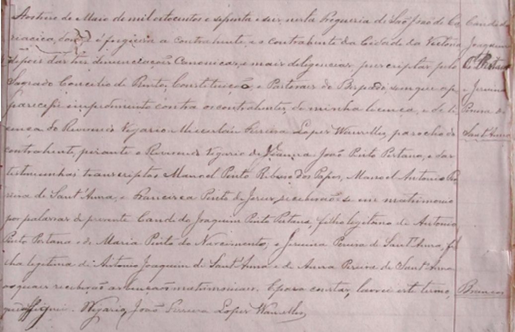 Candido Joaquim Pinto Pestana c.c. Jesuina Pereira de Sant’Anna, filha de Antonio Joaquim de Santa Anna e Anna Pereira de Jesus