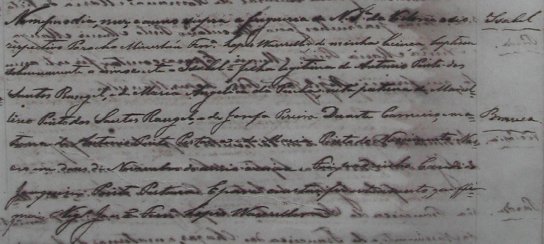 - Izabel, nascida no dia 02/11/1860, batizada no dia 25/12/1860, na freguezia de N.S. da Victoria (Livro de registro de Cariacica-ES)