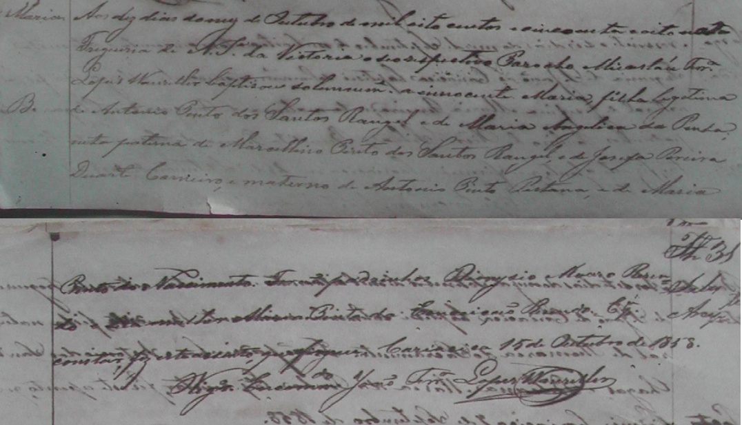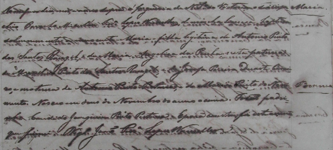 Maria, nascida no dia 02/11/1860, batizada no dia 25/12/1860, na freguezia de N.S. da Victoria (Livro de registro de Cariacica-ES)