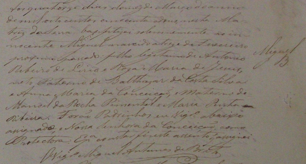 - Miguel, nascido no dia 03/02/1852, batizado no dia 14/03/1852, na Matriz da Serra-ES