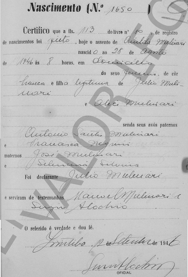 - Julio Molinari c.c. Aleci Mulinari, filha de Jose Mulinari e Selencena Silveira