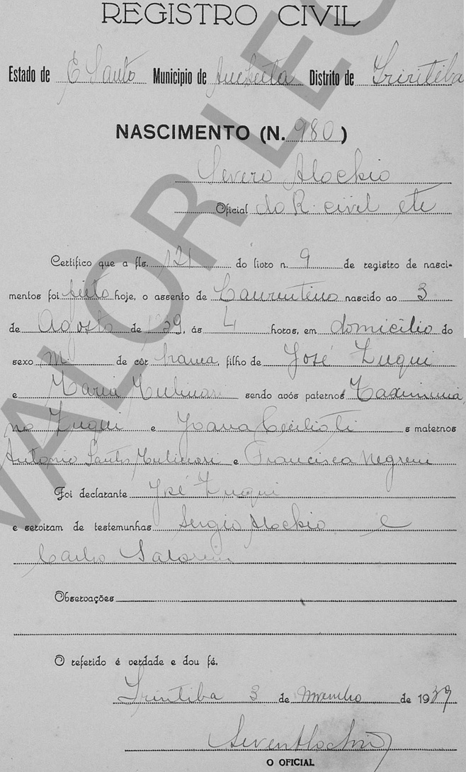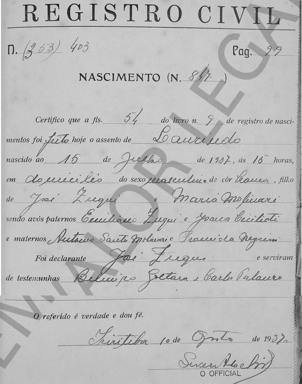 - Laurindo Zuqui (15/07/1937, às 15 horas, em Iriritiba, Anchieta-ES) c.c.