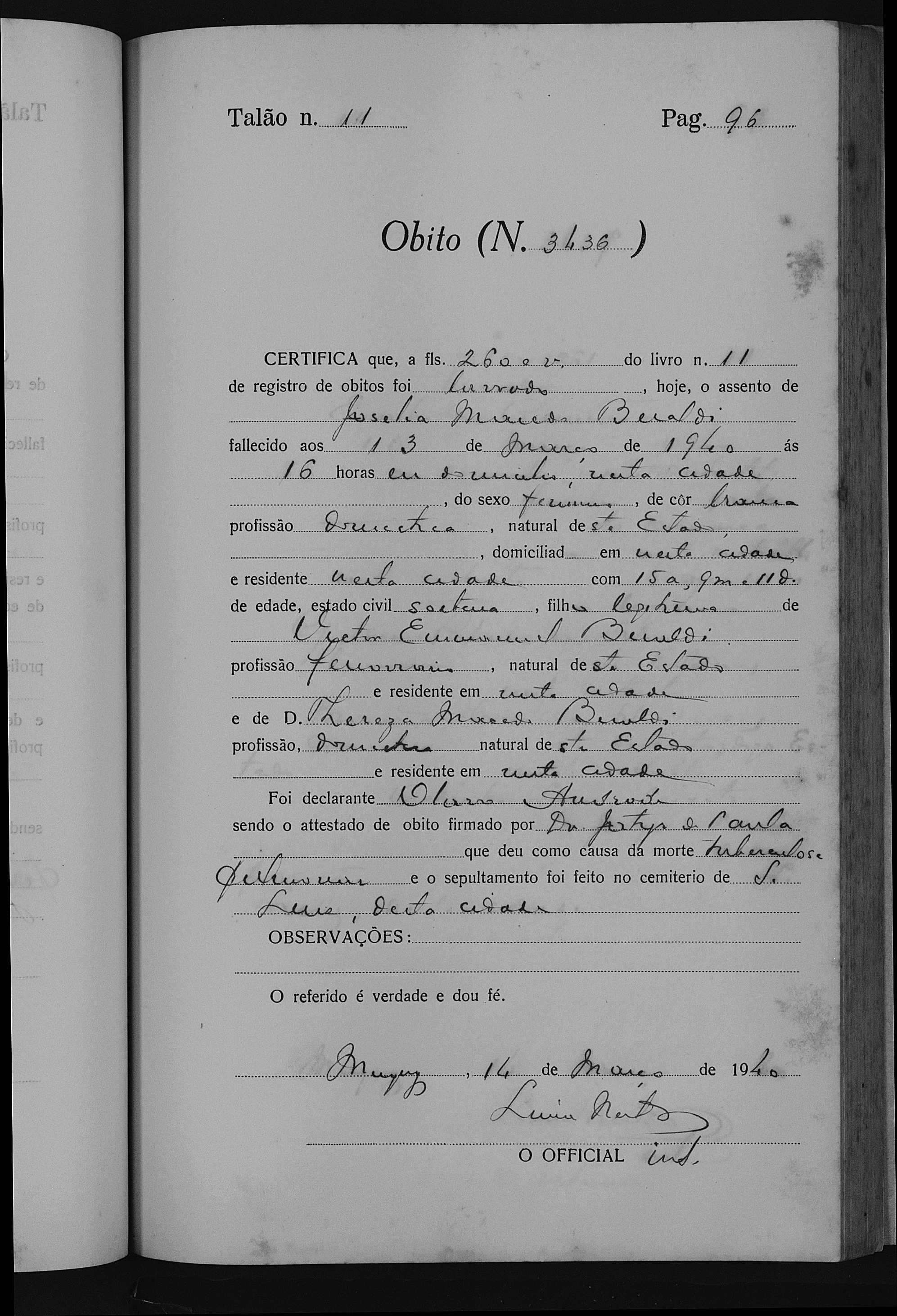 - Joselia Macedo Beraldi, falecida no dia 13/03/1940, às 16horas, com 15a. 9m. 11dias de idade, em Muqui-ES