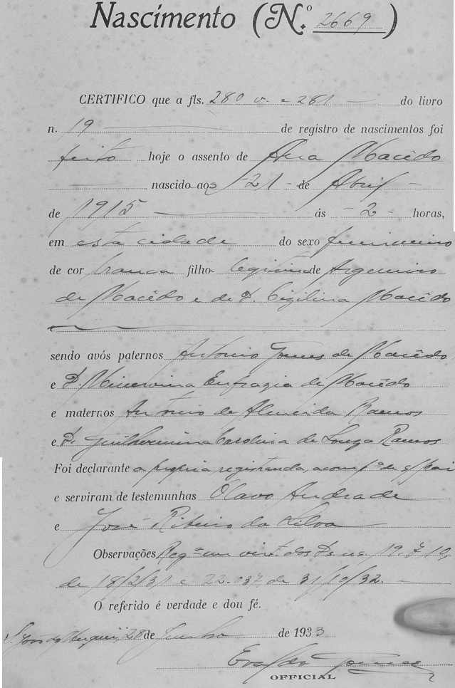Macedo (Nini, nascida no dia 21/04/1915, às 2horas, em Muqui-ES. Jose