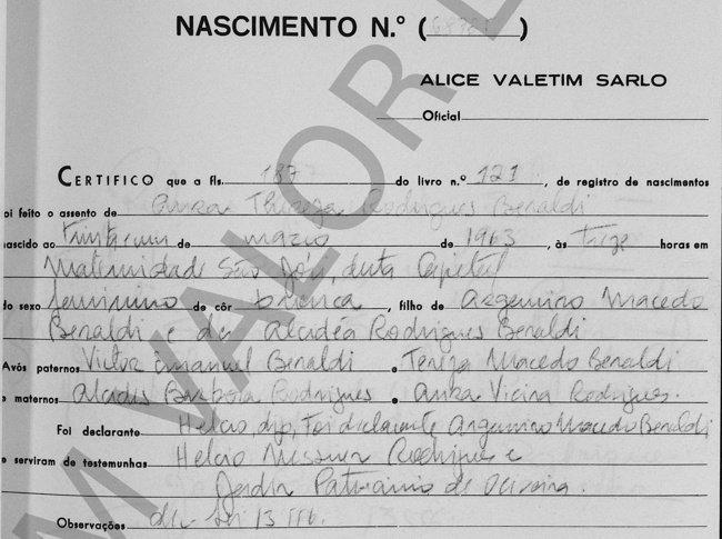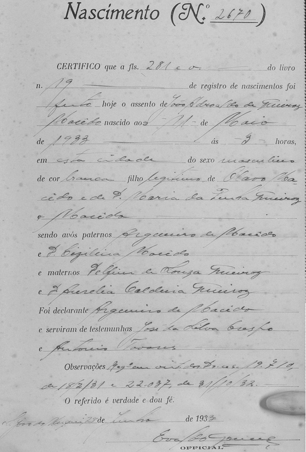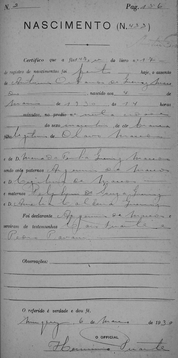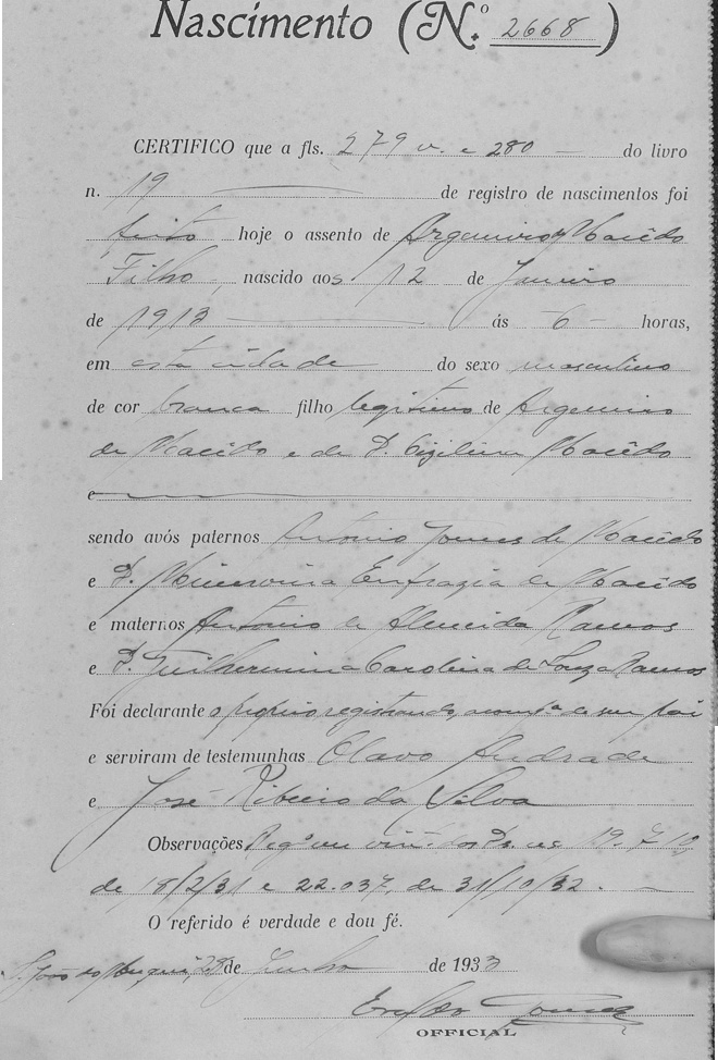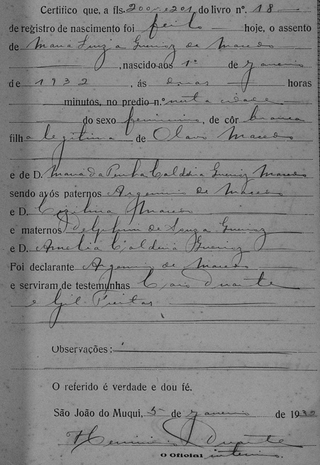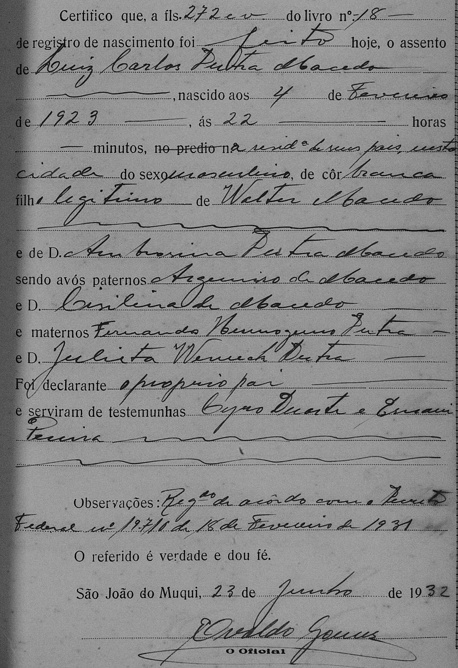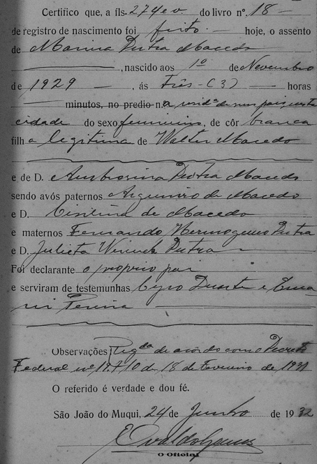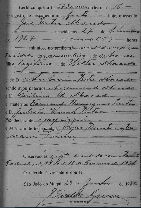 - Walter Dutra Macedo - Morreu solteiro, certamente falecido antes de 23/06/1932, quando os registros de nascimento dos seus irmãos foram oficializados em Cartório, conforme segue.