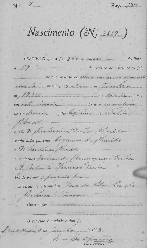 - Natimorto, em 02/06/1933