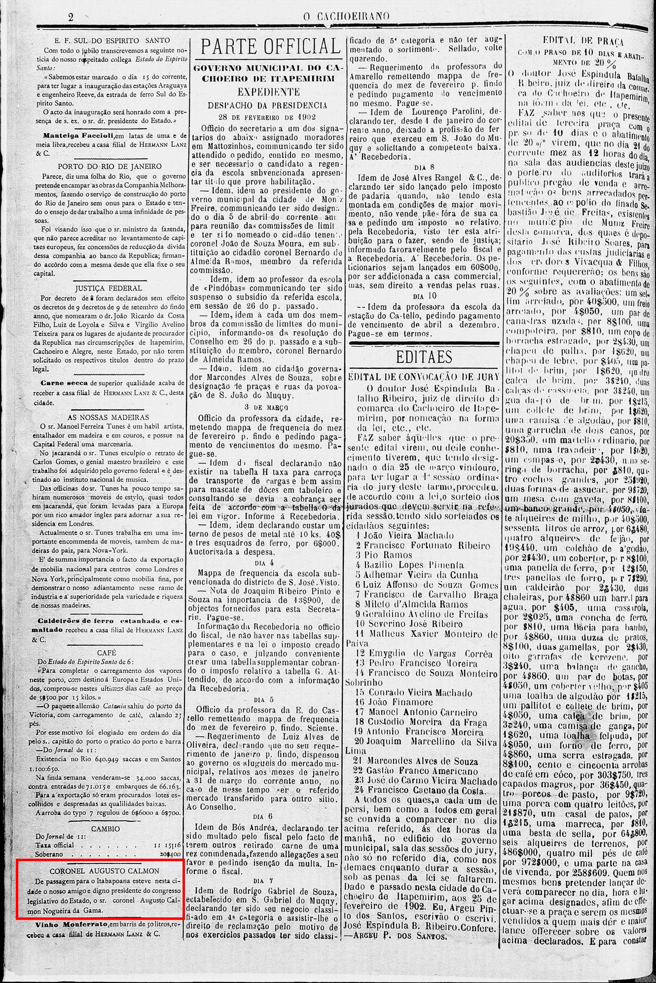 Em 1902 ocupava a função de Presidente do Congresso Legislativo, conforme jornal abaixo