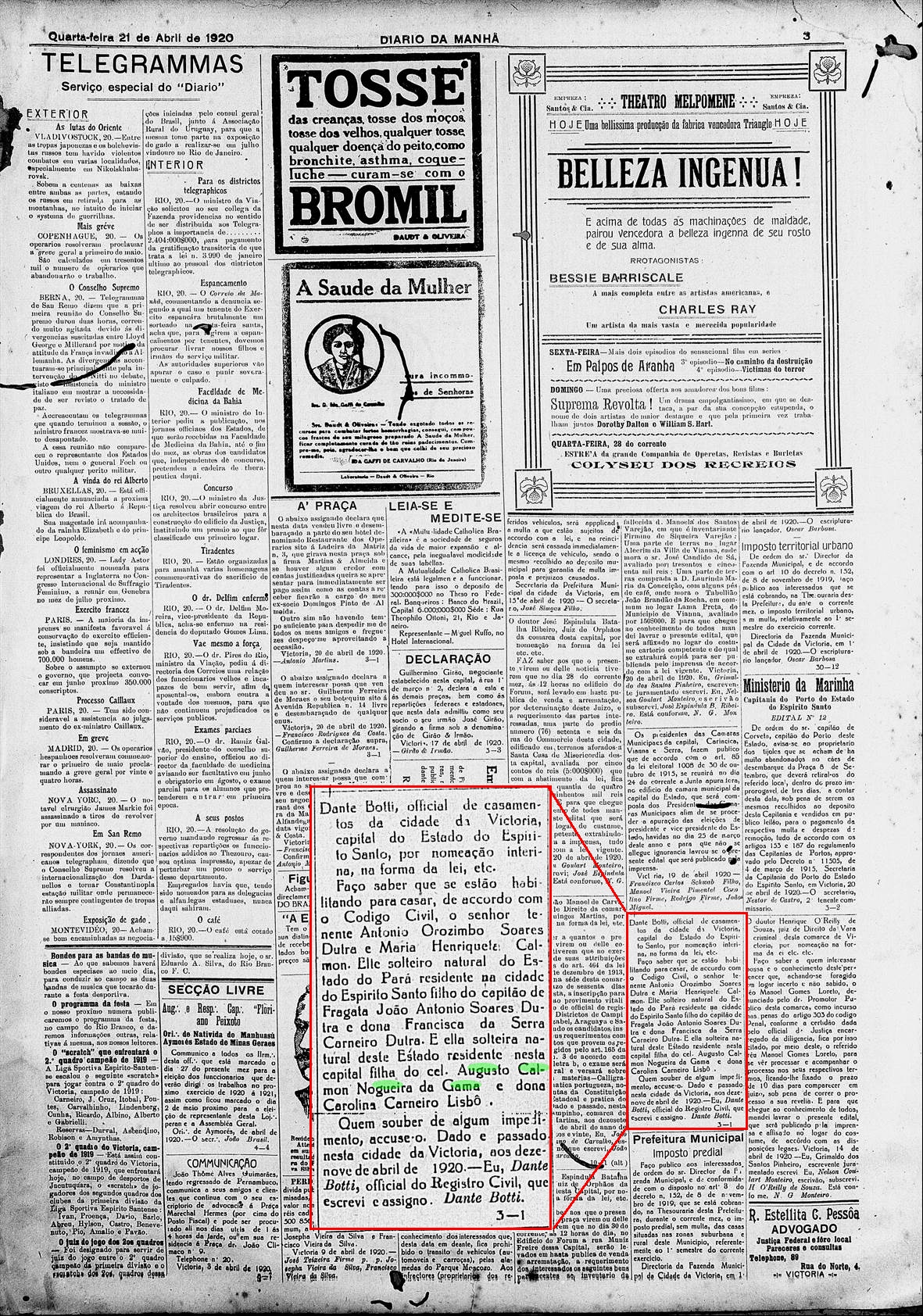 Maria Henriqueta Calmon c.c. Antonio Orozimbo Soares Dutra, natural do Estado do Pará, filho do Capitão de Fragata João Antonio Soares Dutra e Francisca da Serra Carneiro Dutra, conforme jornal de 1920 abaixo