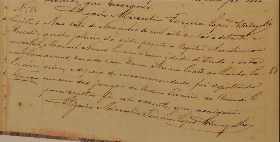 Falecimento do Capitão Aureliano Manoel Nunes Pereira, no dia 07/11/1874, com idade de 38 anos, casado com Anna Pintio da Rocha Pereira