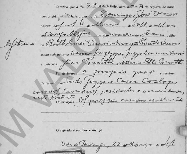 - Domingos Jose Vescovi (16/03/1941, às 11 horas. em Corrego Alegra, Pendanga-ES)