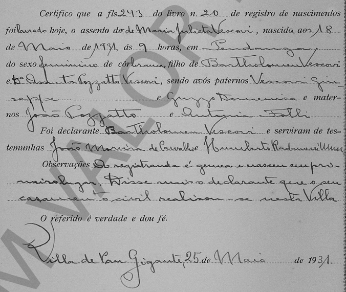 - Maria Julieta Vescovi (gêmea de Romeu) (18/05/1931, às 9 horas, em Pendanga-ES