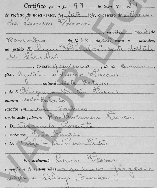 - Maria de Lurdes Vescovi (24/11/1958, Perobas, Distrito de Ibiraçu-ES)