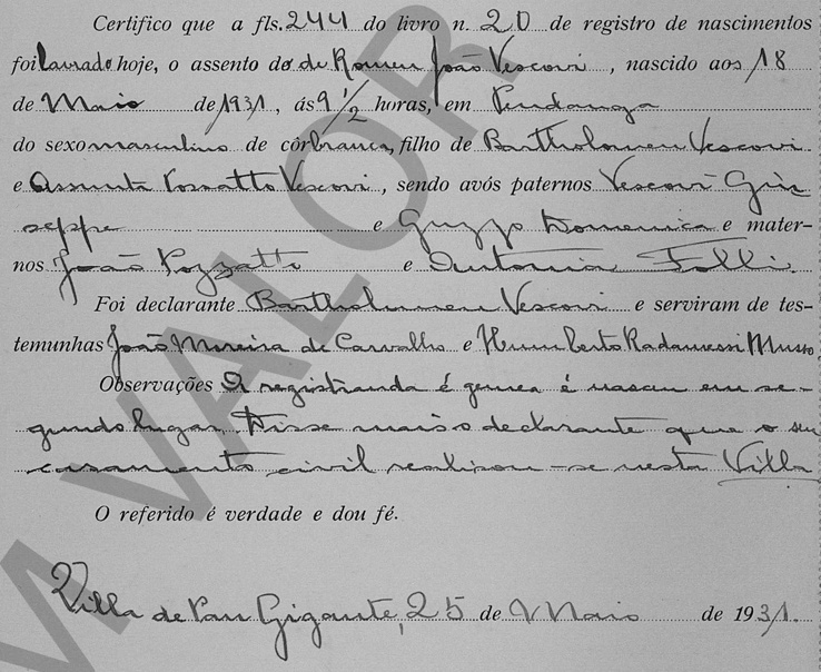 - Romeu João Vescovi (gêmeo de Maria Julieta) (18/05/1931, às 9 1/2 horas, em Pendanga-ES