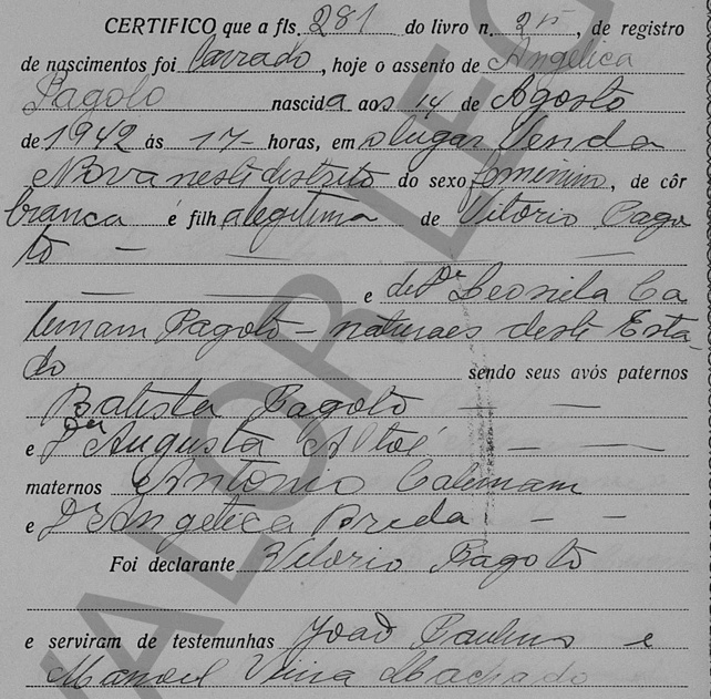 - Angelica Pagoto (14/08/1942, às 14 horas, em Venda Nova-ES)