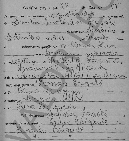 - Santa Deolinda Pagoto (Parda, 16/09/1931, às 18 horas, em Venda Nova, Castelo-ES)