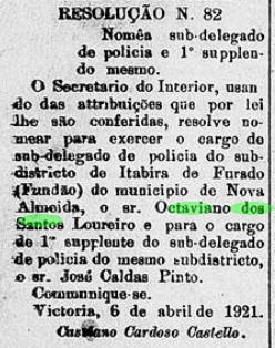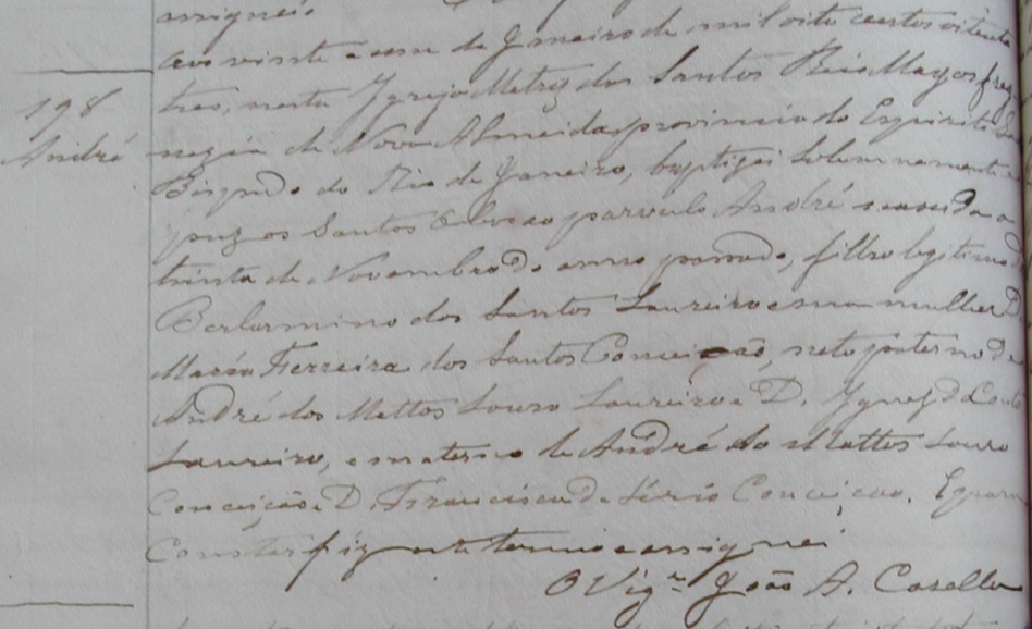 Andre, nascido no dia 30/11/1882, batizado no dia 21/01/1883, na Igreja Matriz dos Santos Reis Magos da freguesia de Nova Almeida-ES
