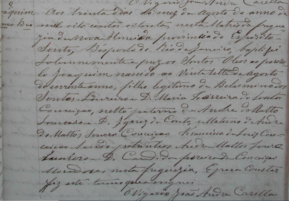 Joaquim, nascido no dia 27/08/1880, batizado no dia 30/08/1880, na Matriz de Nova Almeida-ES