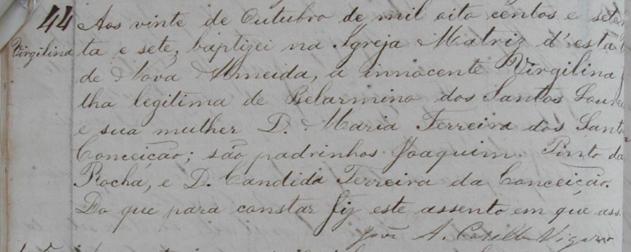Virgilina, batizada no dia 20/10/1877, na Matriz de Nova Almeida-ES