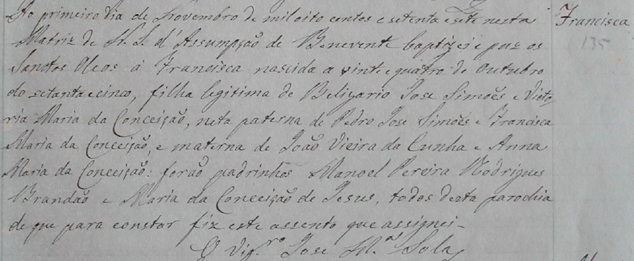 - Francisca, nascida no dia 24/10/1875, batizada no dia 01/11/1877, na Matriz de de Nossa Senhora da Assumpção de Benevente-ES