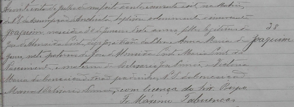 Padrinhos: Joaquim Vieira da Cunha e Maria Manoela da Penha