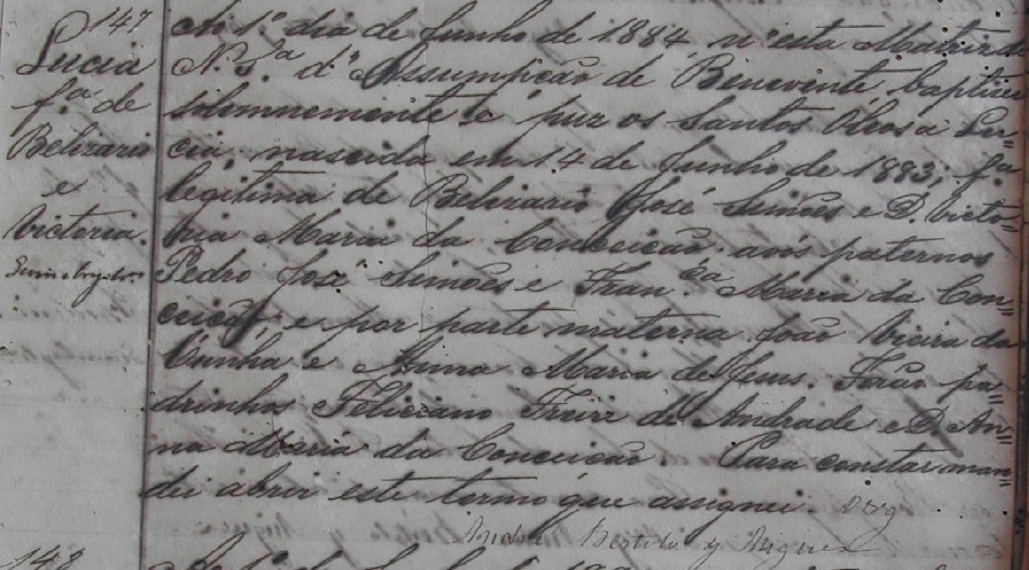- Lucia, nascida no dia 14/06/1883, batizada no dia 01/06/1884, na Matriz de de Nossa Senhora da Assumpção de Benevente-ES