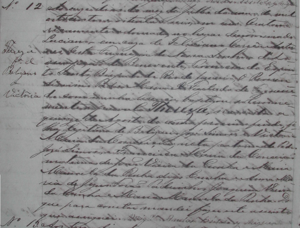 - Thereza, nascida no dia 15/08/1885, batizada no dia 11/07/1886, num Oratorio ricamente adornado, no lugar denominado Luciano, em casa de Feliciano Correa Antunes, da Freguezia de Nossa Senhora da Assumpção de Benevente-ES