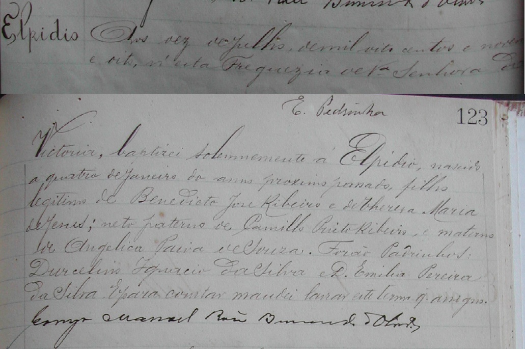 - Elpidio, nascido no dia 04/01/1898, batizado no dia 10/07/1898, na Freguezia de Nossa senhora da Vitoria-ES