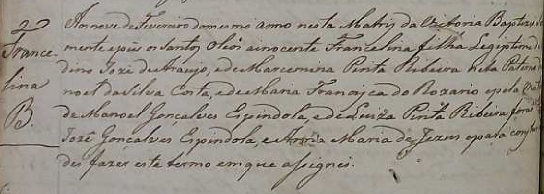 - Francelina, batizada no dia 09/02/1845, na Matriz de Vitoria-ES