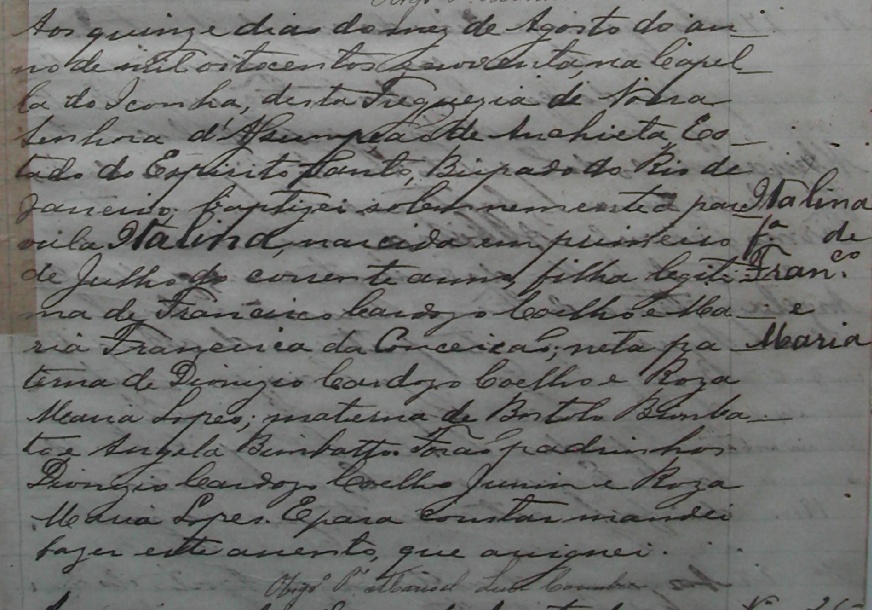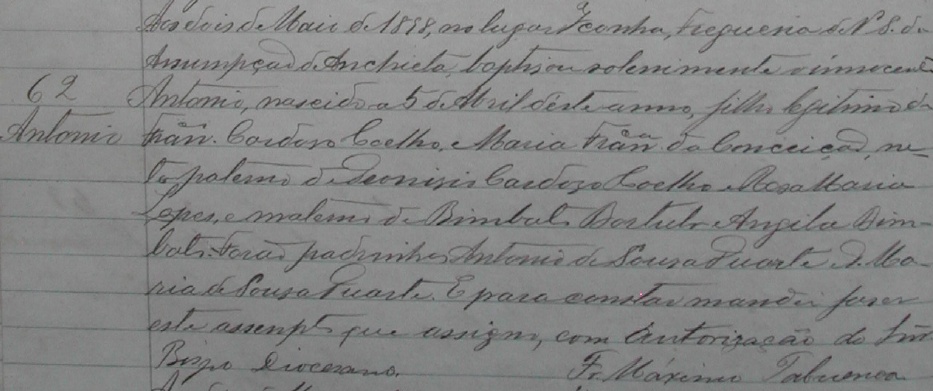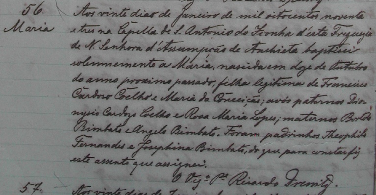 - Maria, nascida no dia 12/10/1892, batizada no dia 20/01/1893, na Capela de Santo Antonio de Iconha, da Freguezia de Nossa Senhora da Assumpção de Anchieta-ES