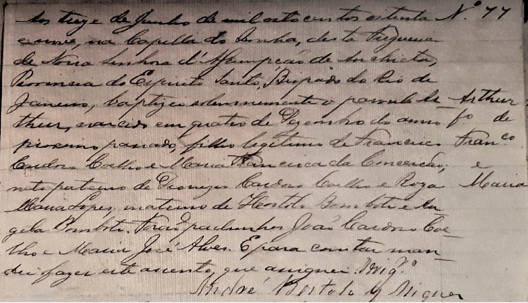 - Arthur, nascido no dia 04/12/1888, batizado no dia 13/06/1889, na Freguezia de Nossa Senhora da Assumpçãio de Anchieta-ES