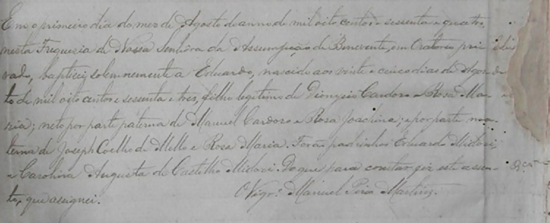 Fonte: Nascimento-Batismo Eduardo Cardoso; Nossa Senhora da Assunção de Benevente, BR.CMV.NSA.BAT.L.001, Batismos 1861-1868, fol. 73 reto