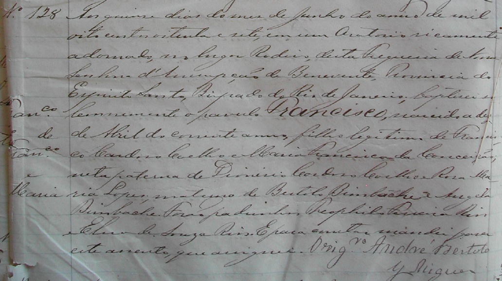 - Francisco, nascido no dia 10/04/1887, batizado do dia 15/06/1887, no lugar Rodeio, da Freguezia de Nossa Senhora da Assumpção de Benevente-ES
