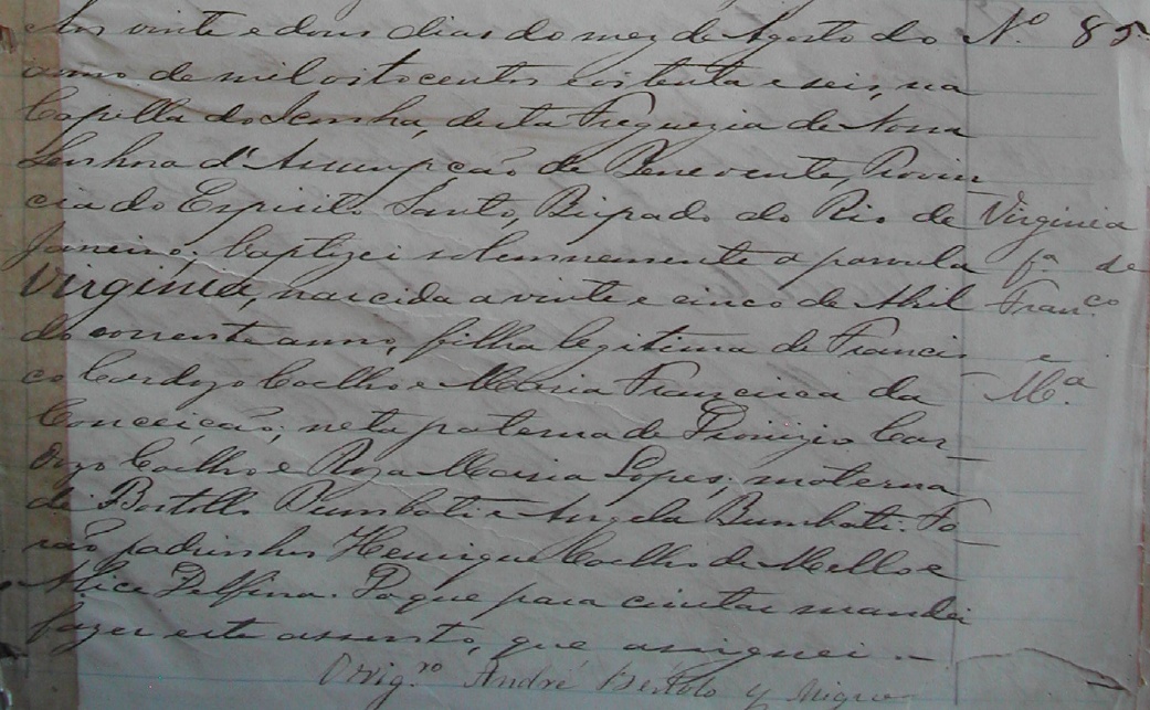 - Virginia, nascida no dia 25/04/1886, batizada no dia 22/08/1886, em Iconha-ES