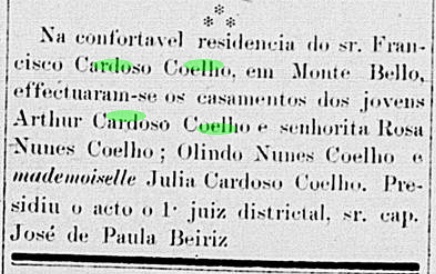 Arthur Cardozo Coelho c.c. Roza Nunes Cardozo, filha de Jose Cardoso Coelho e Maria Nunes Coelho