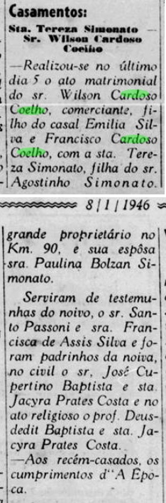 - Wiilson Cardoso Coelho (comerciante) c.c. Tereza Simonato, filha de Agostinho Simonato e Paulina Bolzan Simonato (grandes proprietários no Km 90)