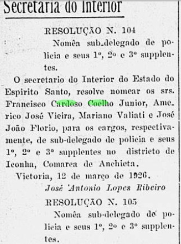 Francisco Cardoso Coelho Junior - Sub-delegado de polícia, 1926, em Iconha-ES