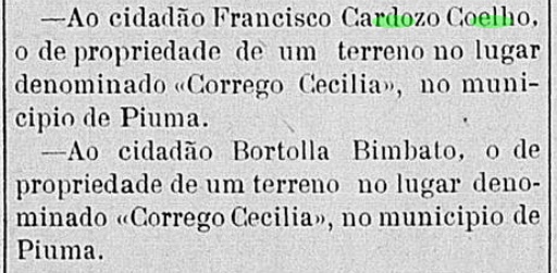 Fonte: FamilySearch.org, Brasil, Espírito Santo, Registros do Estado; 15 de setembro de1904 Comissariado Geral de Medições de Terras Públicas do Estado do Espirito Santo; 1° Secção, 3° Distrito, Requerente: Francisco Cardoso Coelho; Autos de mediação e discriminação de um terreno devoluto no lugar "Corrego Cecilia", Município de Piúma, Area 214.500m2; Expecta-se título ao 12/05/1903; Página 6 reto; Consultado 8/03/2024.